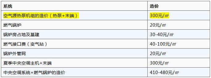 因此,空氣源熱泵供暖制冷系統(tǒng)的造價(jià)比中央空調(diào)+燃?xì)忮仩t系統(tǒng)的造價(jià)低110-180元/㎡.