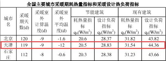 根據《全國主要城市采暖期耗熱量指標和采暖設計熱負荷指標》,天津地區節能建筑每平方米采暖季供暖所需熱量為28.83w/㎡*24h*119d/1000≈82.34kwh/㎡