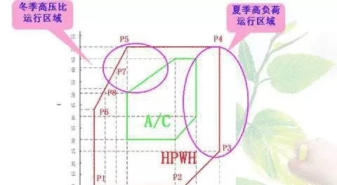 圖中,橫軸對應蒸發溫度(相當于熱泵的室外環境溫度),縱軸對應冷凝溫度(相當于熱泵的使用側的出風或水溫度),可以看出,熱泵壓縮機的運行范圍是在空調壓縮機上有成倍的擴大。