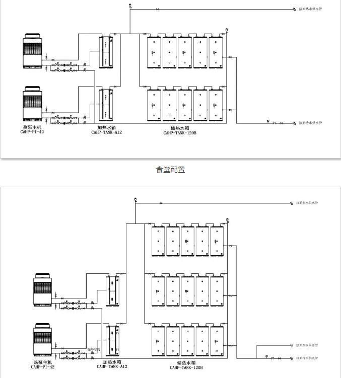 食堂:2臺10匹承壓式熱泵主機(jī)+2臺12kW