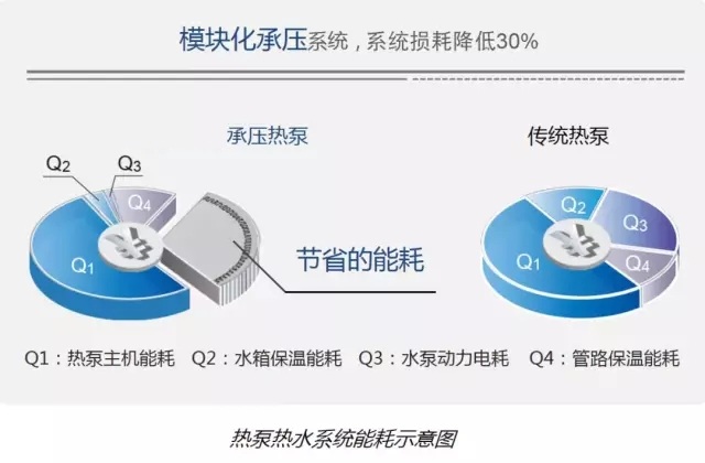 模塊化承壓熱泵系統(tǒng)與普通開式熱泵系統(tǒng)相比,在系統(tǒng)輸送環(huán)節(jié),還可極大程度地降低系統(tǒng)中水箱散熱損失、水泵的動力電能消耗等,從而大幅節(jié)省運(yùn)營成本。