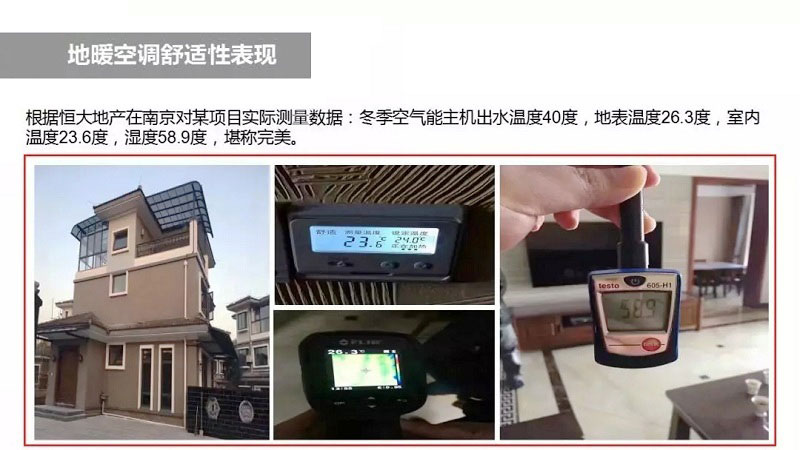 恒大地產在南京對某項目進行了實際測量,得出地暖空調運行時室內的溫濕度數據:冬季空氣能主機出水溫度40℃,地表溫度26.3℃,室內溫度23.6℃、濕度58.9℃,可以說是非常舒適的生活環境,深刻體現了地暖空調的舒適性。
