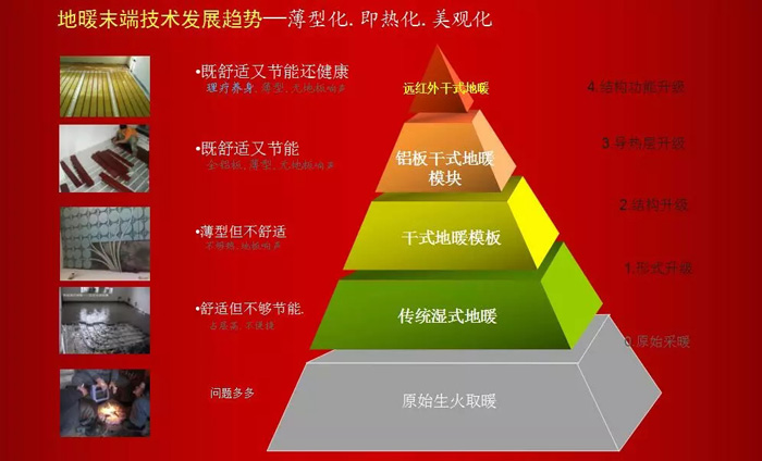 上圖是我做的一個(gè)地暖末端在技術(shù)上的發(fā)展趨勢(shì):薄型化——即熱化——美觀化,這個(gè)大家可以看圖了解一下,具體我就不作解說(shuō)了。