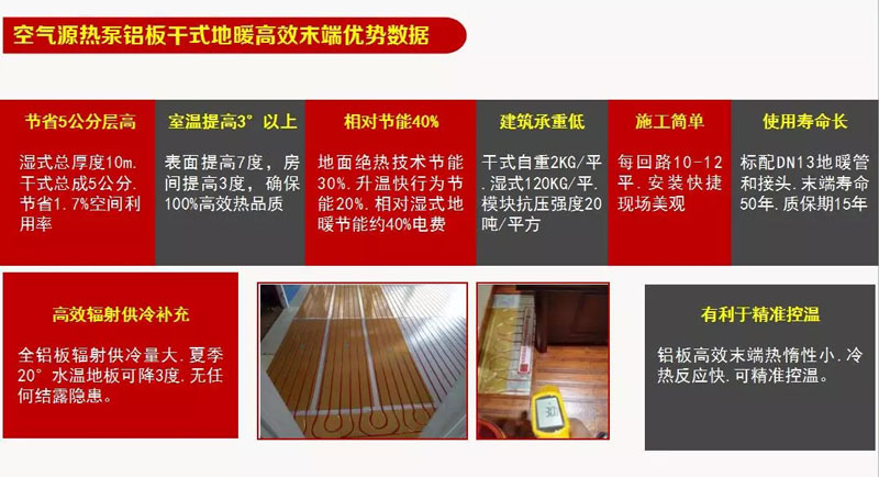 其中,系統(tǒng)標(biāo)配:1)全鋁板干式地暖模塊;2)分水器;3)DN13地暖管;4)專(zhuān)用接頭。這里我做了一個(gè)空氣源熱泵鋁板干式地暖高效末端優(yōu)勢(shì)數(shù)據(jù)圖,這個(gè)很寶貴,具體優(yōu)勢(shì)大家可以看下圖: