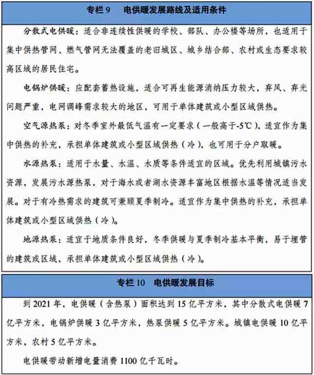 以“2+26”城市為重點,在熱力管網覆蓋不到的區域,推廣分散式電供暖,科學發展集中電鍋爐供暖,鼓勵利用低谷電力,有效提升電能占終端能源消費比重。根據氣溫、水源、土壤等條件特性,結合電網架構能力,因地制宜推廣使用空氣源熱泵、水源、地源熱泵供暖,發揮電能高品質優勢,充分利用低溫熱源熱量,提升電能取暖效率。