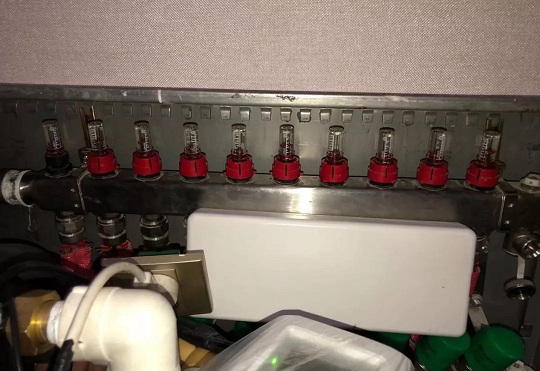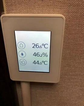 在分集水器前端加裝了混水中心,全自動(dòng)化調(diào)節(jié)地暖供水溫度,實(shí)現(xiàn)氣候補(bǔ)償技術(shù)。室內(nèi)裝有中央控制器,溫濕度露點(diǎn)控制面板,夏季地板可制冷,處理圍護(hù)結(jié)構(gòu)負(fù)荷,實(shí)現(xiàn)露點(diǎn)保護(hù)技術(shù)。室外部分PUN601離心泵,影響混水閥出水的準(zhǔn)確度,更換為PUN200離心泵泵,降低外置水泵對(duì)混水閥的影響,同時(shí)降低了運(yùn)行能耗。二次側(cè)只用一臺(tái)15-8的高效泵負(fù)責(zé)末端循環(huán),調(diào)試時(shí)分集水器流量計(jì)顯示3L/min說(shuō)明地暖側(cè)水流量充足。