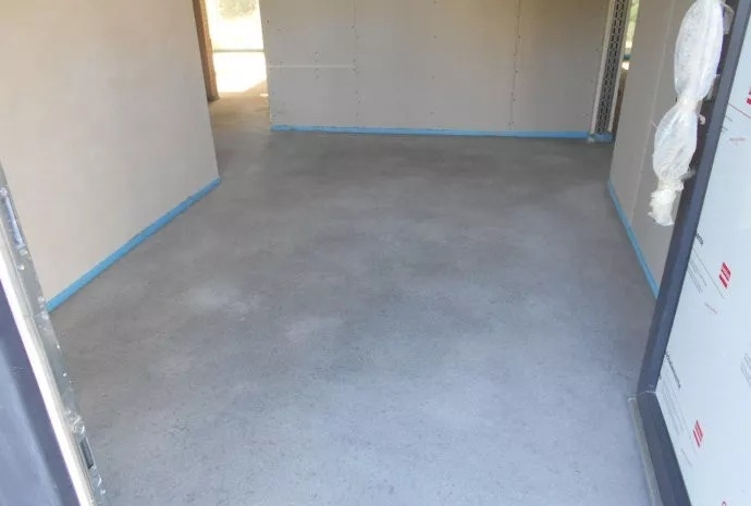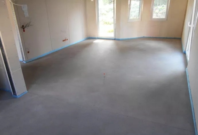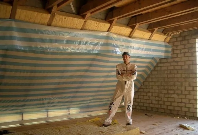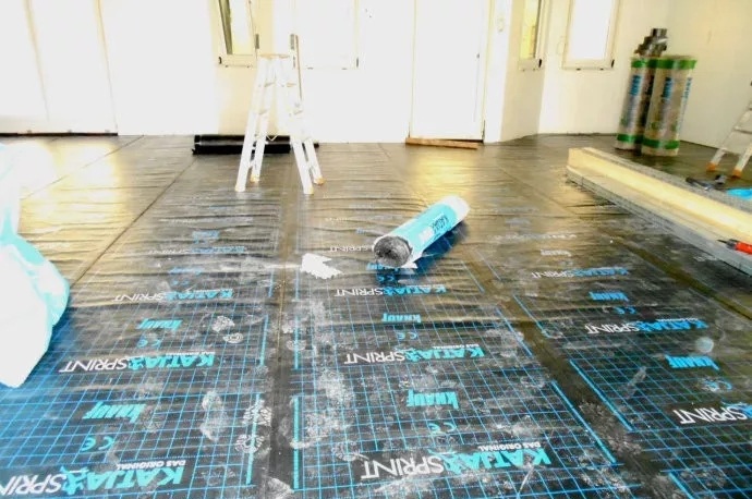 圖為地暖地面構造中,最底層的防水隔潮膜的鋪設施工現場