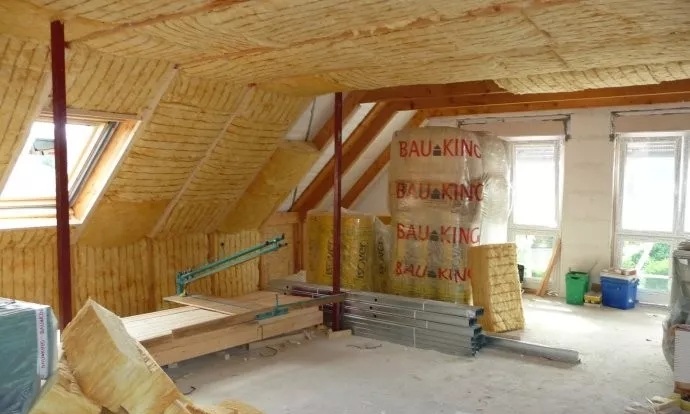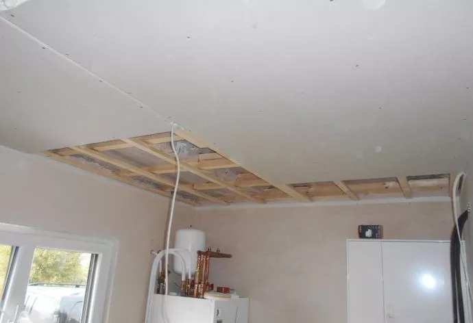 設備間的內部,天花板的底部,石膏板的釘貼,施工現場