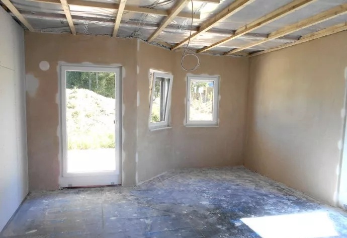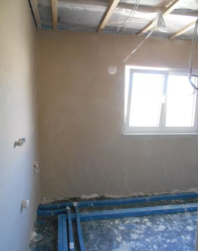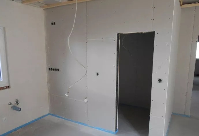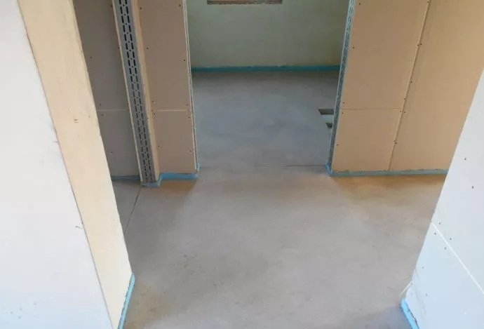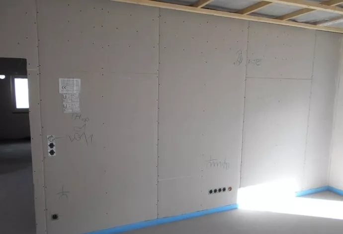 室內石膏板墻面,機械噴涂專用防水涂料,裝飾施工現場。