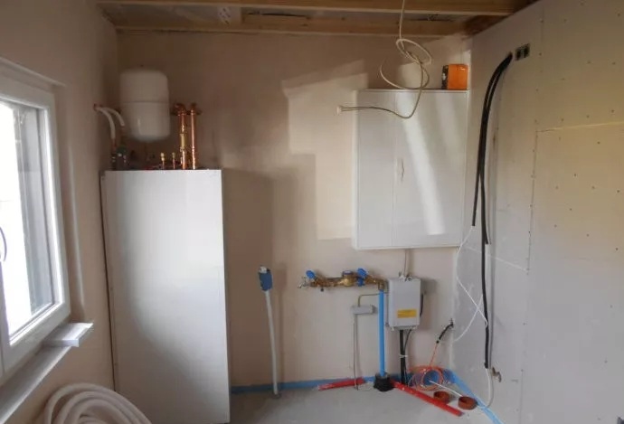 房屋內部,設備間,自來水、電力、通訊線纜,以及“空氣源熱泵”系統的室內主機,安裝現場,局部特寫。