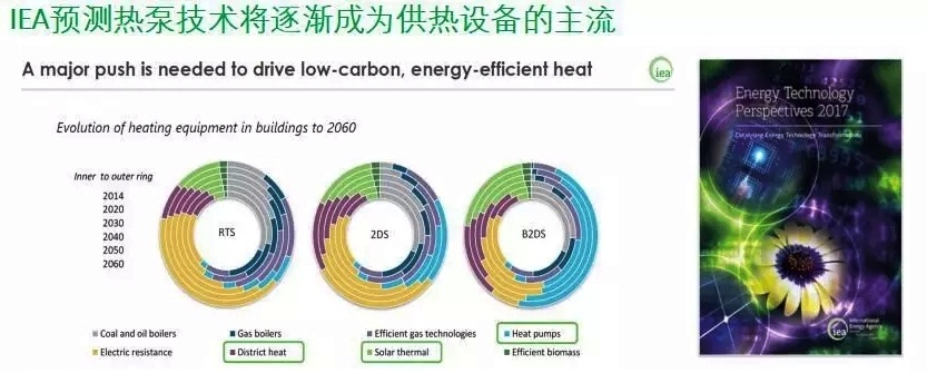 如上圖所示,在國際能源署2017能源技術(shù)展望中指出,自2014年至2060年,隨著年份的不斷推移,空氣源熱泵供熱等(Heat pumps)、太陽能(Solar thermal)、燃氣壁掛爐(Gas boilers)等主要供熱產(chǎn)品所占比重也將會發(fā)生改變,隨著空氣源熱泵供熱等應(yīng)用的逐年增長,在2030年將全球氣候升溫控制在2℃以內(nèi)的總體目標就會得到逐步實現(xiàn),甚至超越目標。
