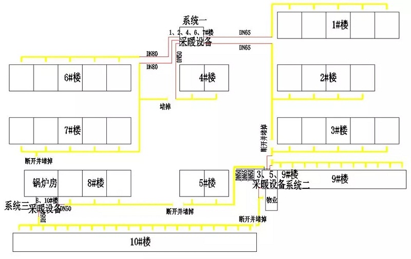 這個(gè)案例在陜西,一共有10棟住宅和物業(yè)管理,1~8號(hào)樓為6層,9~10號(hào)樓是1~2層,采暖面積一共42900多平,原先在8號(hào)樓東南角有一個(gè)燃煤鍋爐房。下圖是鍋爐房原先的管網(wǎng)布置,供暖系統(tǒng)由鍋爐房循環(huán)泵經(jīng)室外管網(wǎng)分別送到各棟樓室內(nèi)的采暖系統(tǒng)。